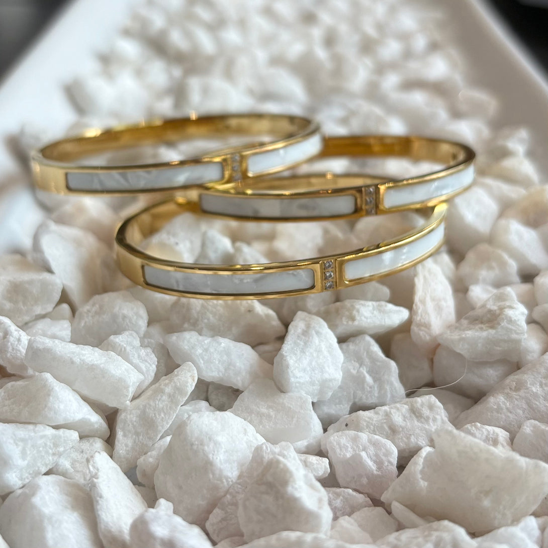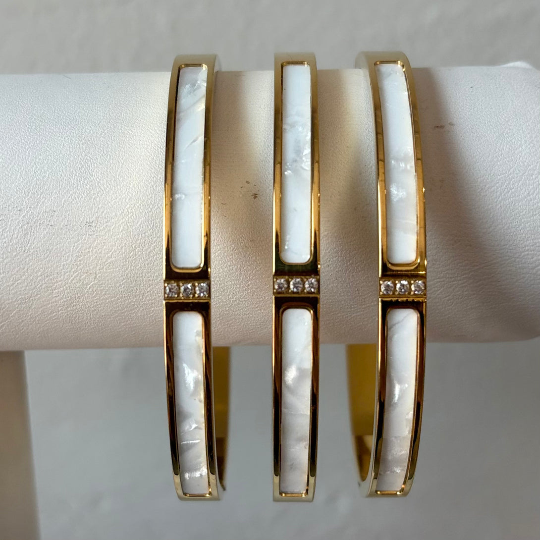 Gracefully refined, this elegant cuff blends timeless materials with modern sophistication. Crafted from durable stainless steel and luxuriously plated in 18k gold, the piece exudes a warm, radiant finish. A luminous channel of genuine mother of pearl softly catches the light, offering iridescent beauty with every movement. Delicately embedded cubic zirconia stones add a subtle sparkle, creating a balanced contrast between softness and shine.