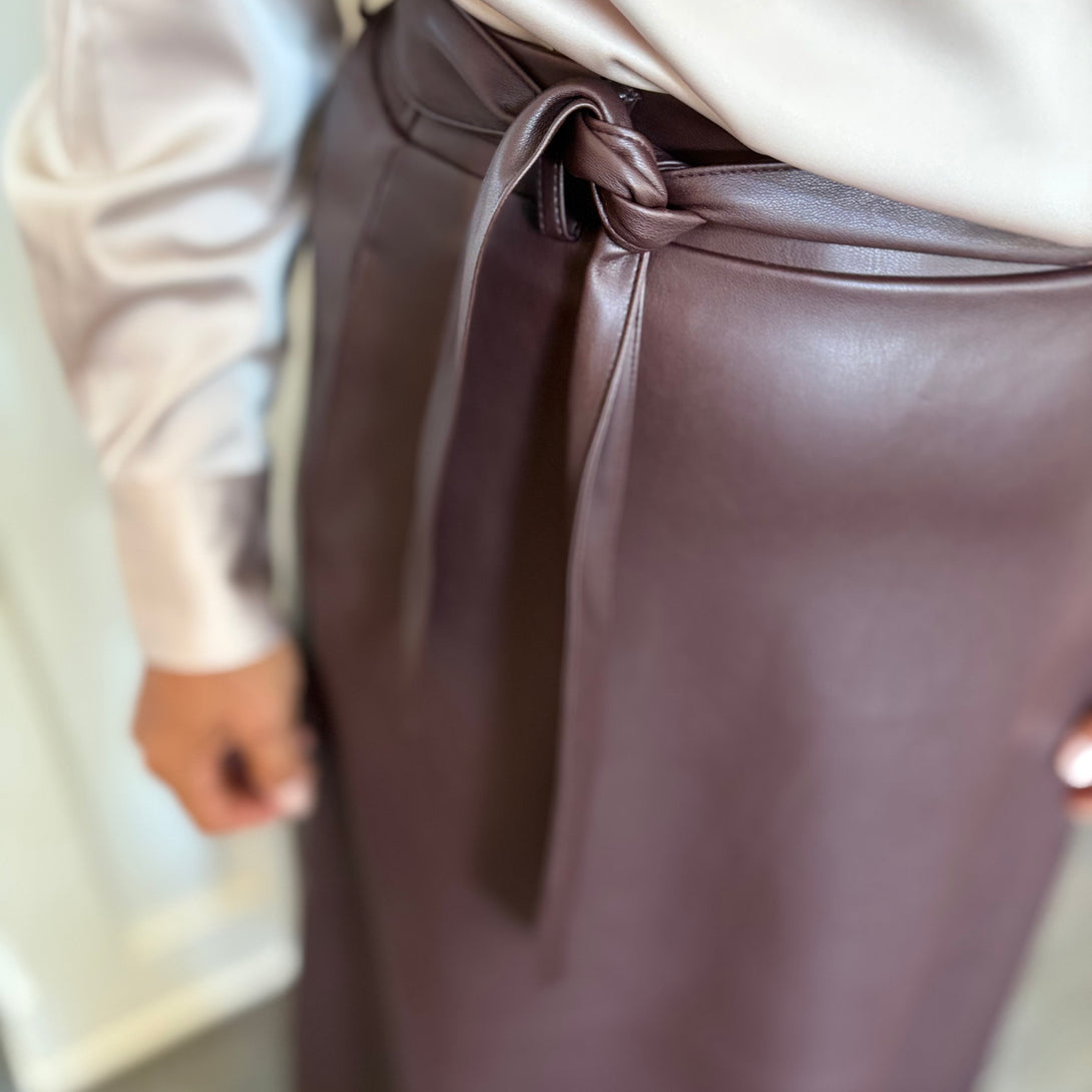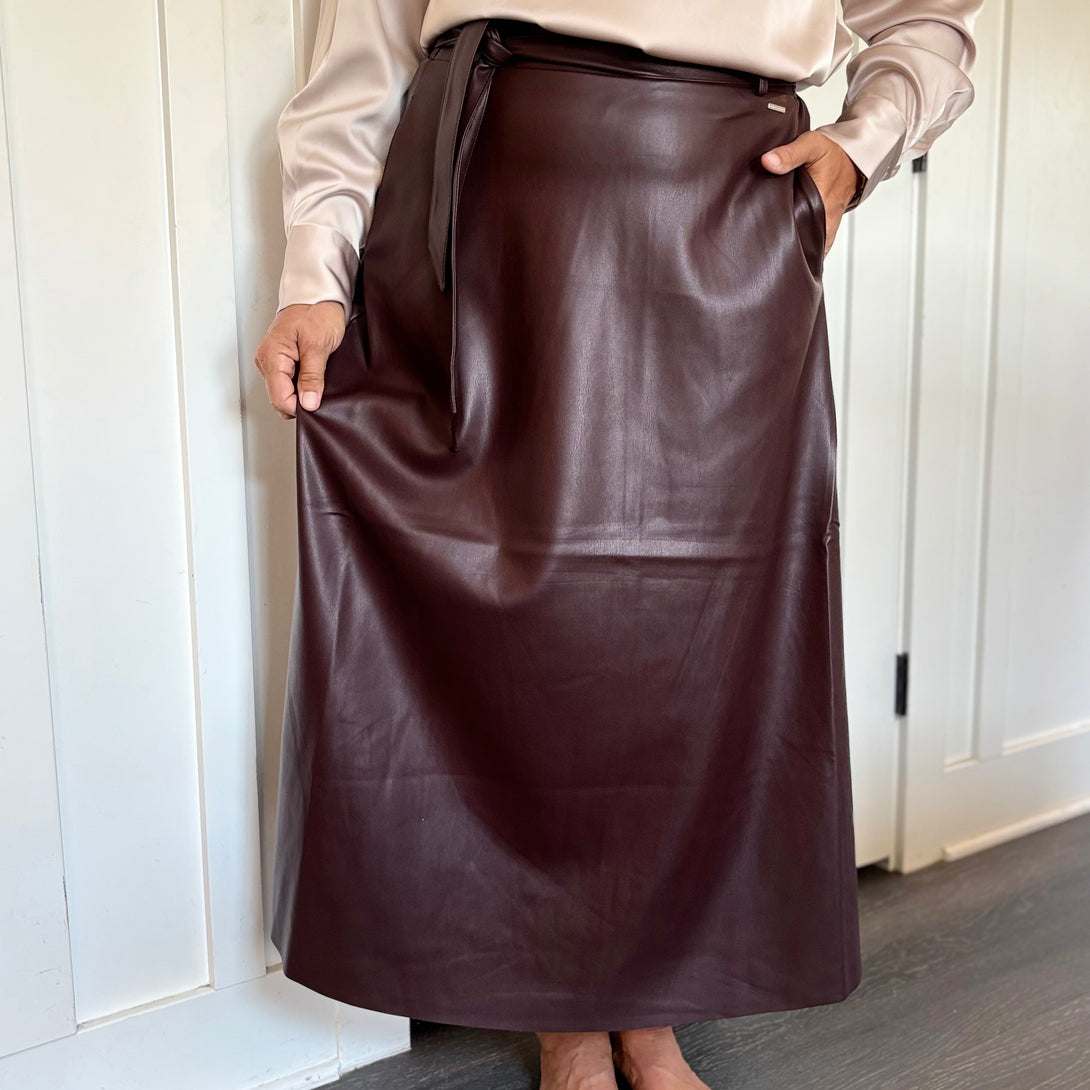 Sophistication meets modern edge with this midi-length faux leather skirt. A refined staple designed to bring you from day to night in an effortless way. The high quality, ethically sourced faux leather is buttery soft designed to hug and flow in all the right places. A softly cinched waist is accentuated by a simple let beautiful self-tie adding subtle structure and a hint of relaxed elegance. Whether styled with a silk shirt, or an oversized knit, this skirt brings drama and sophisticated versatility to your wardrobe.