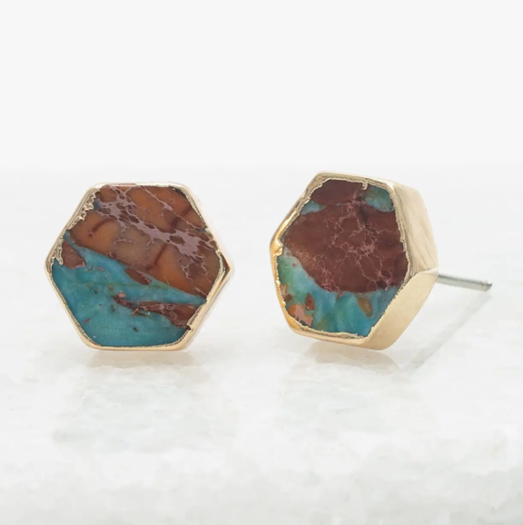 Infused with the warm glow of sunrise over red rock canyons, the Desert Sky Studs feature emperor stone in swirls of turquoise and copper-red, wrapped in radiant 14K gold plating. These everyday studs capture the untamed beauty of the desert—wild, warm, and full of quiet strength. With each wear, you share the story of a woman rising in freedom—your purchase helps create a path to independence and healing.