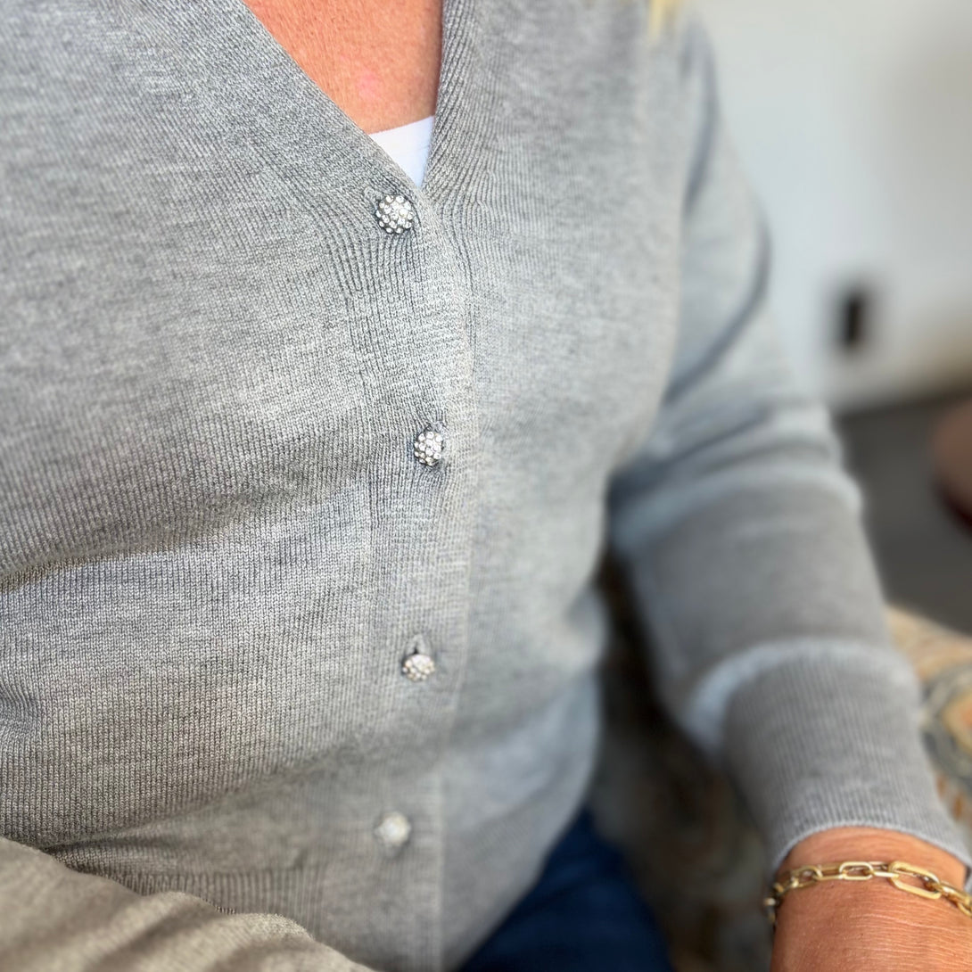 A timeless wardrobe staple, reimagined with refined details. Crafted in a soft blend of 75% viscose and 25% nylon, the regular fit and V-neckline make it endlessly versatile, while the button closure with sparkling cubic zirconia accents adds just the right touch of understated elegance.