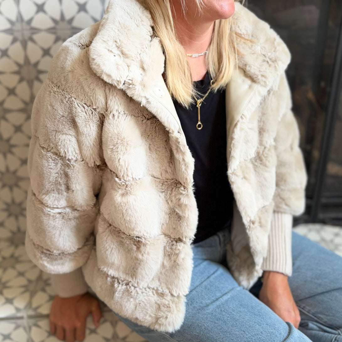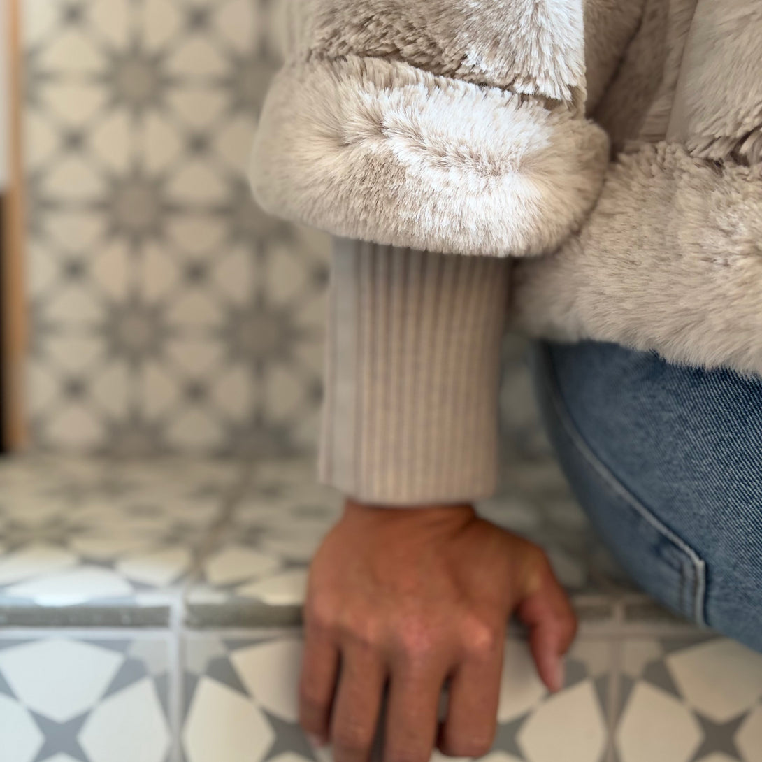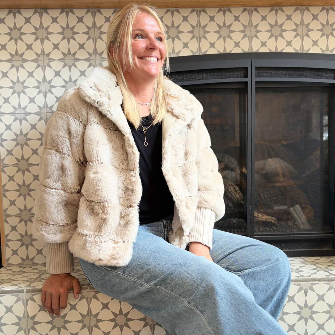Sophisticated warmth meets effortless wearability in this birch-tone faux fur jacket. Designed with an approachable elegance, it features a button closure, discreet functional pockets, and knitted detail along the bottom quarter of the sleeves for added comfort and texture.