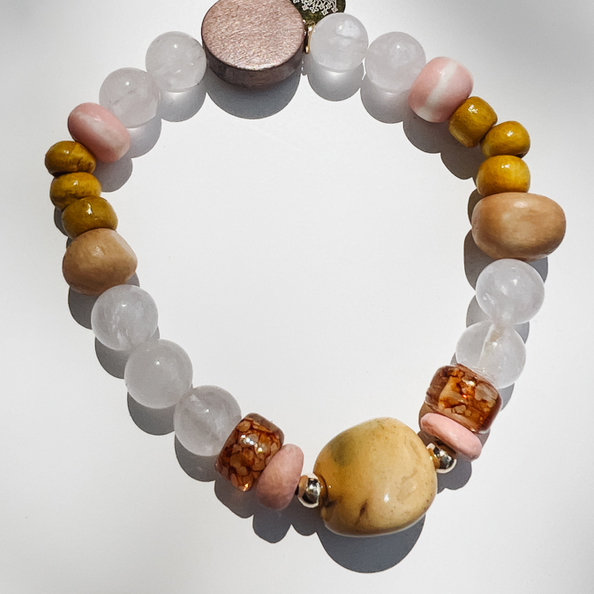 Features Mookaite Jasper (varies in color from mustard to cream), wood, brass, glass beads, Stretch bracelet fits wrists up to 7 1/2" inches.