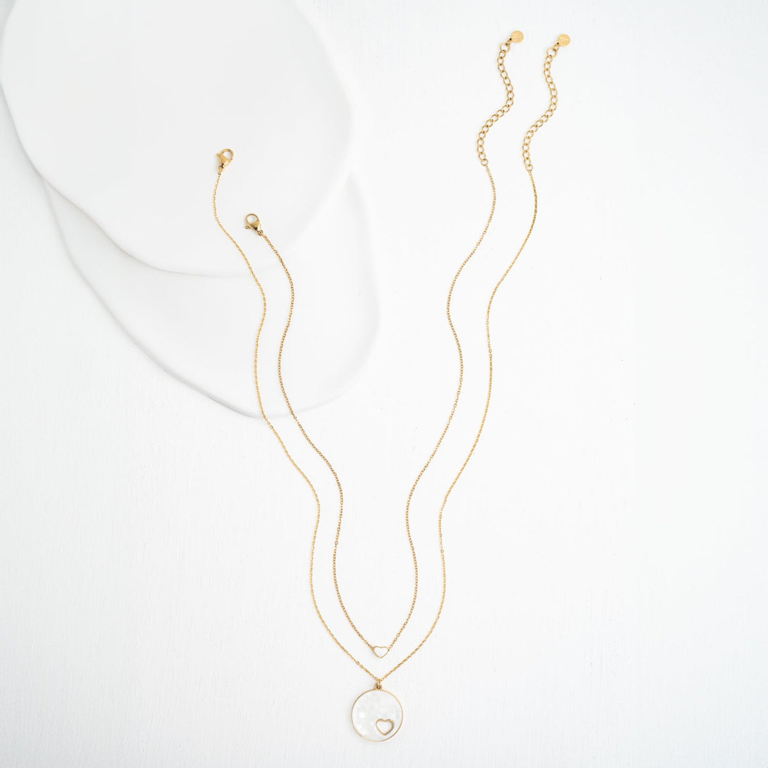 Online Only. The Journey Together Necklace Set in mother of pearl is a beautiful expression of unity, transformation, and empowerment. The first necklace features a larger circle pendant, adorned with the soft, iridescent glow of mother of pearl, with a tiny heart cutout at the center—symbolizing love and connection. The second necklace features a smaller charm, also reversible, with one side showcasing a tiny heart-shaped piece of mother of pearl, while the other side shines in radiant gold.