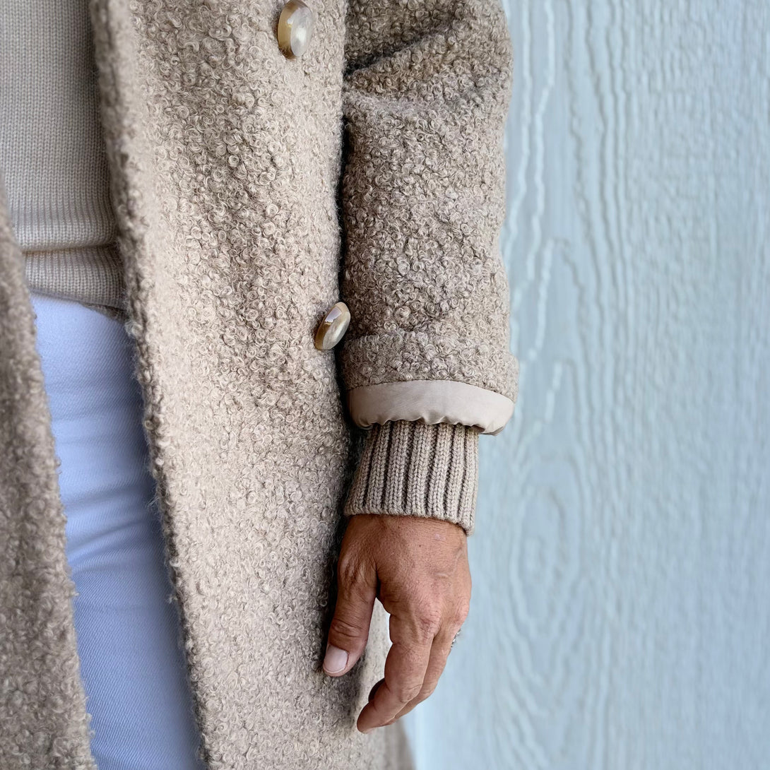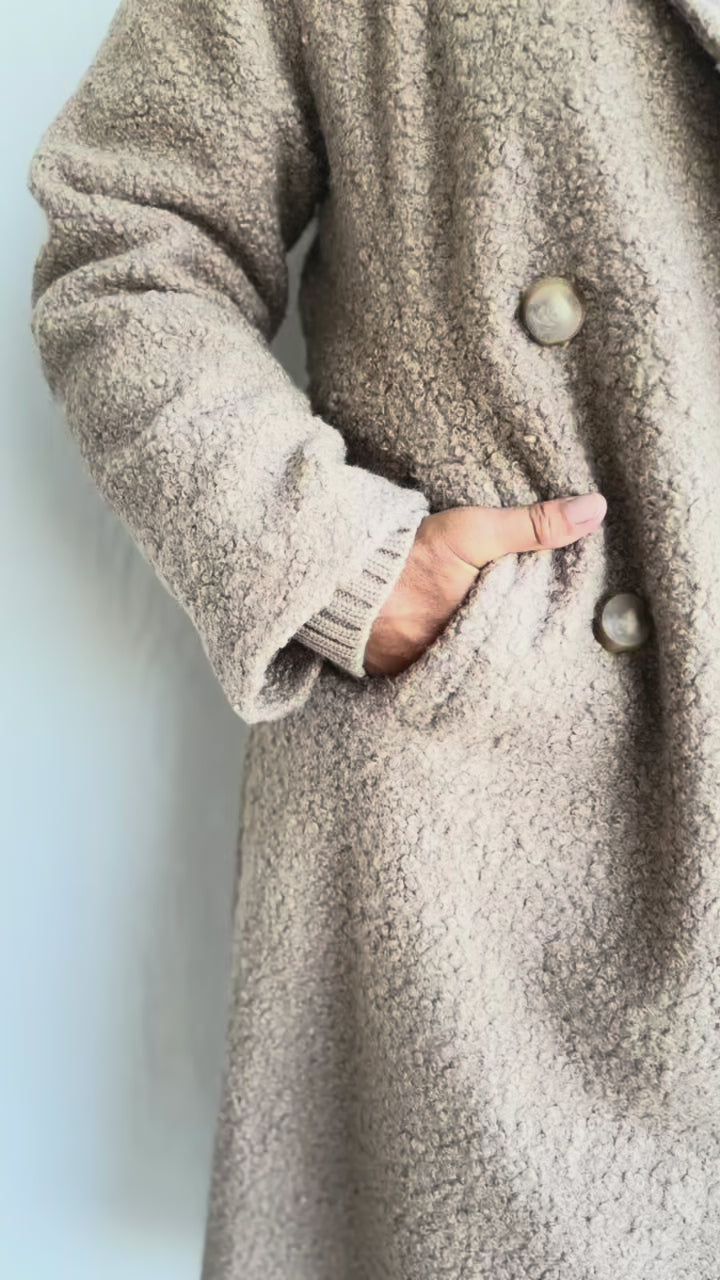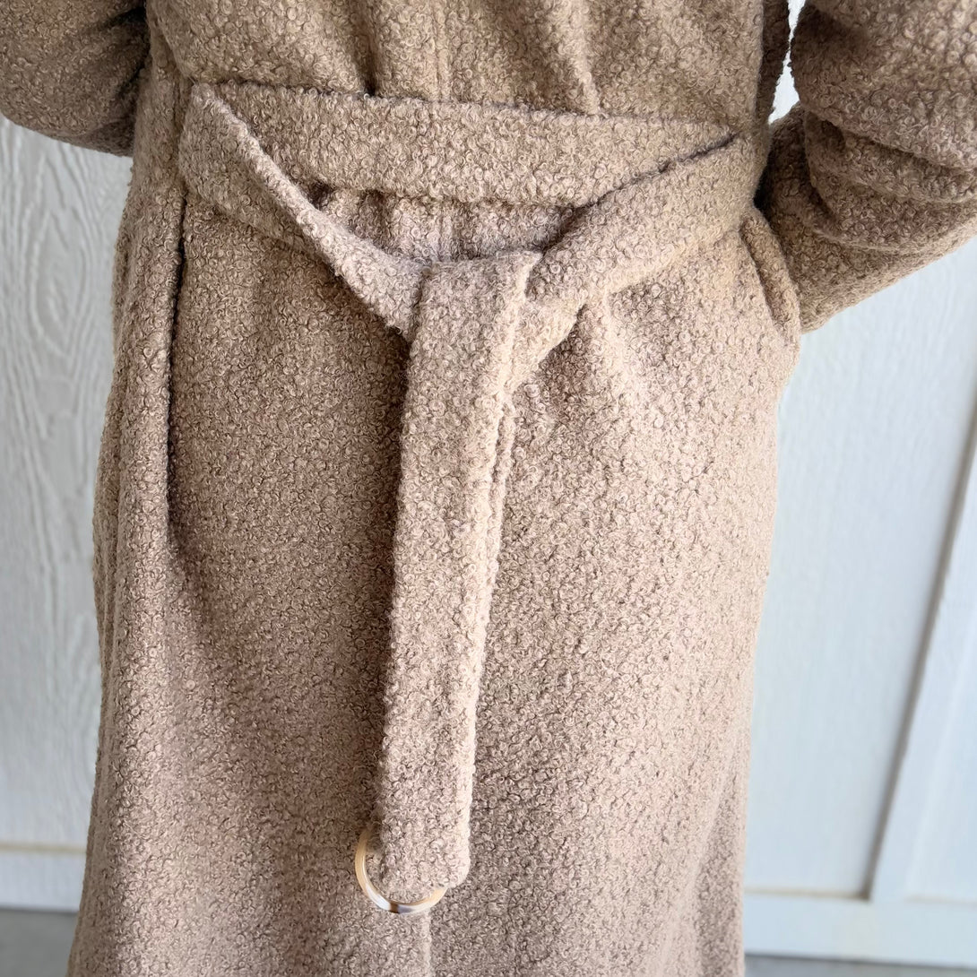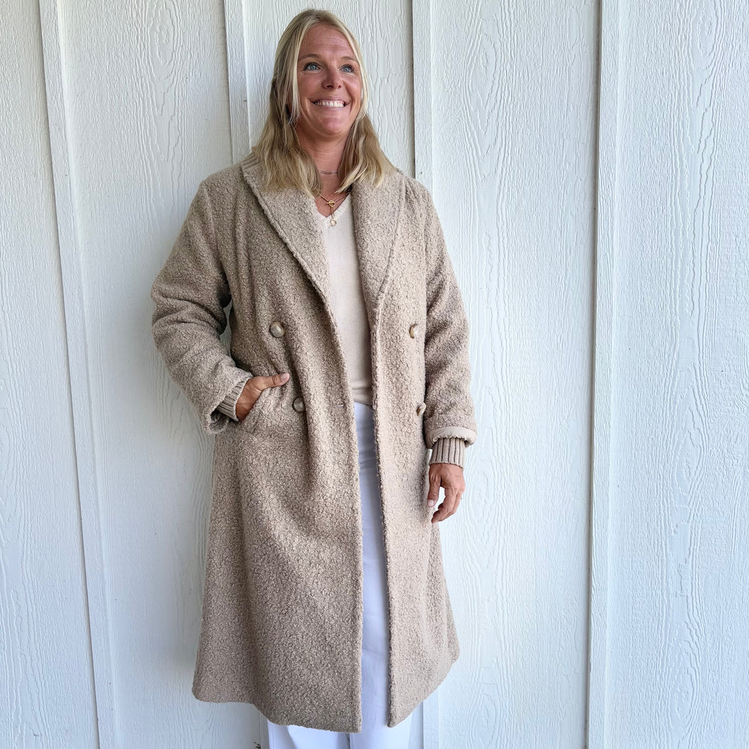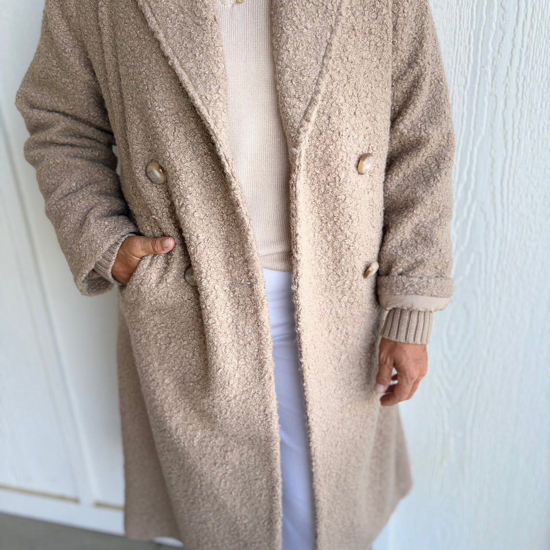 Timeless tailoring meets elevated texture with this ultra soft-boiled wool long coat. Crafted from premium boiled wool, this coat offers natural warmth, structure, and softness that is perfect for cool weather refinement. The double-breasted front commands attention, while the belt cinches the waist to accentuate your silhouette. The long length of this coat makes it ideal for layering over both casual and formal styles.