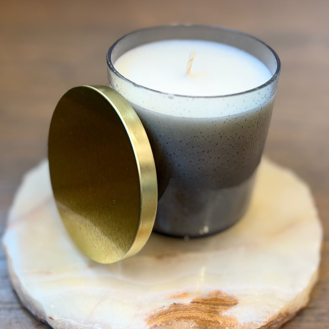 Black Currant Absinthe candle, hand-poured in a grey glass jar with a gold lid, made from 100% soy wax and pure essential oils
