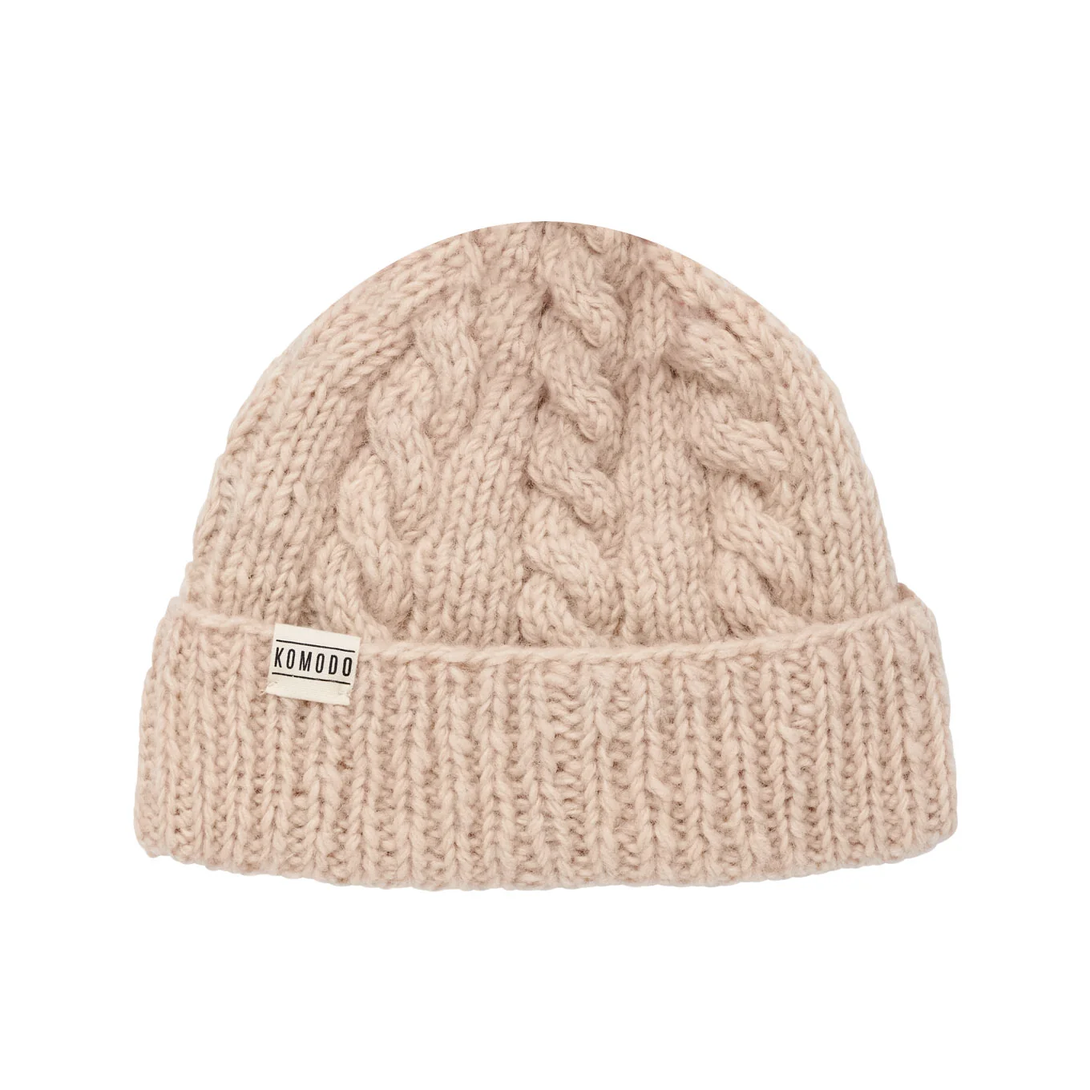 This 100% lambswool Matterhorn hat will keep you warm all winter long. The lining is made of recycled microfleece. This beautiful cable knit hat comes in two colors, cream and blue.