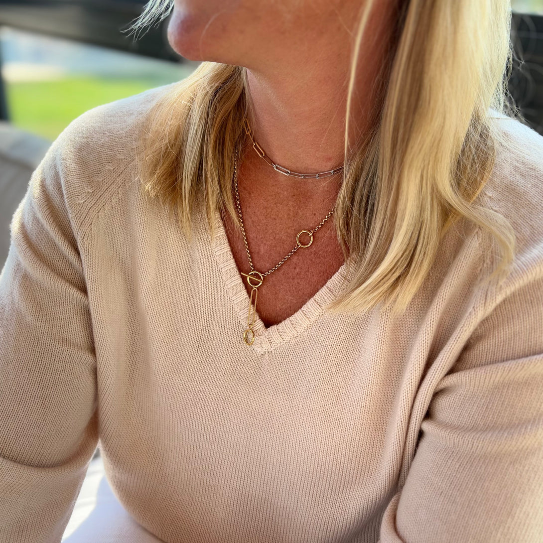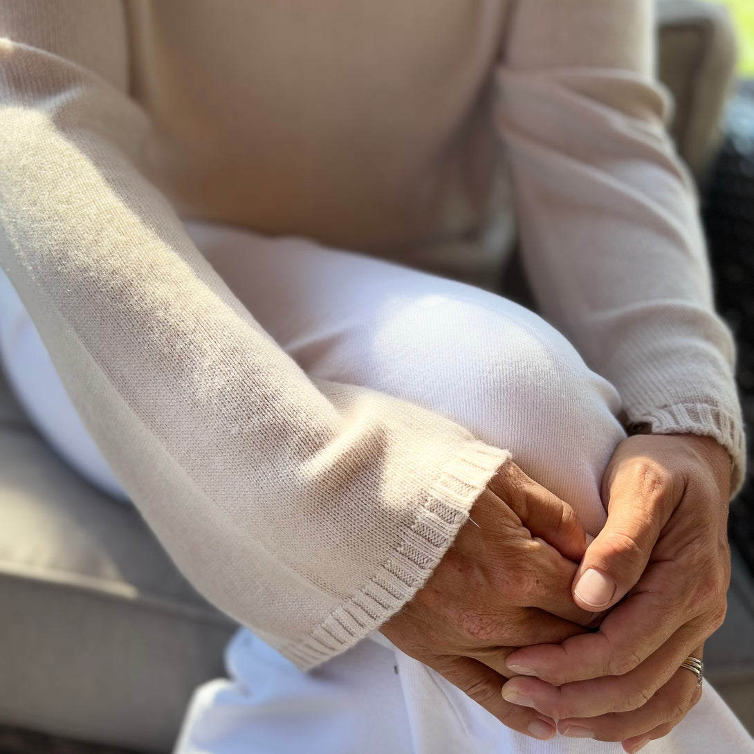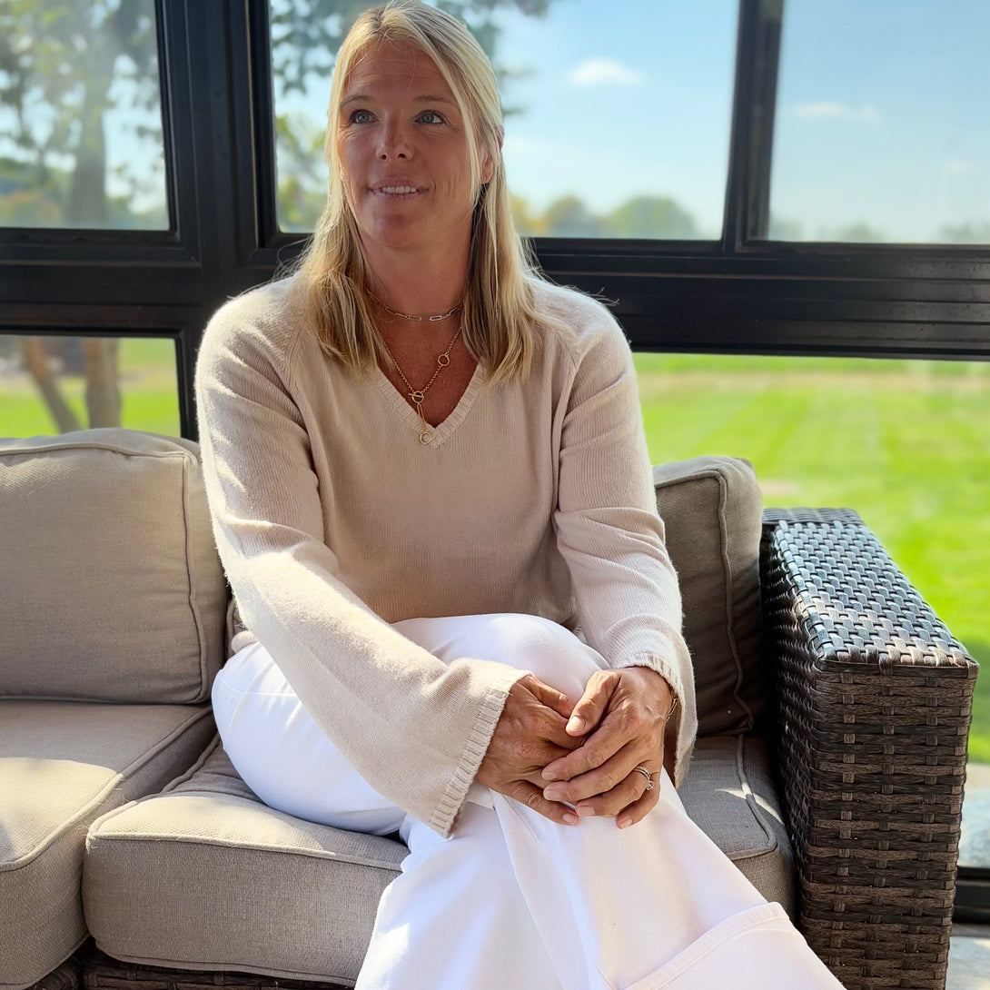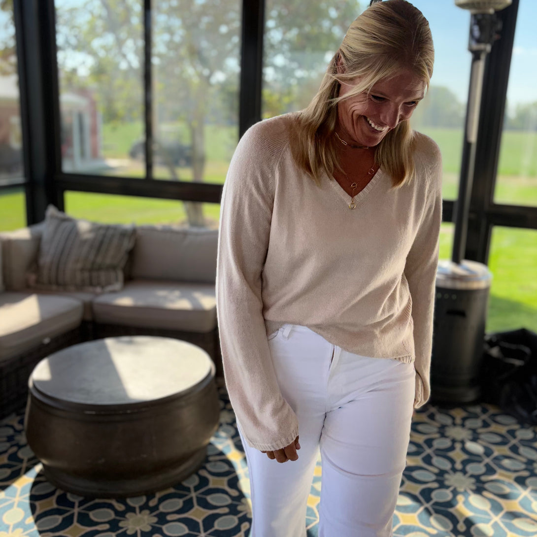 Luxuriously soft, this 100% fine merino wool v- neck sweater comes in a classic shade of oat. This loosely fitted sweater is perfect alone, layered over a collared shirt, or under a jacket. Pair her with your favorite denim for a casual, but classy, style, or with a leather skirt for an elevated appeal.