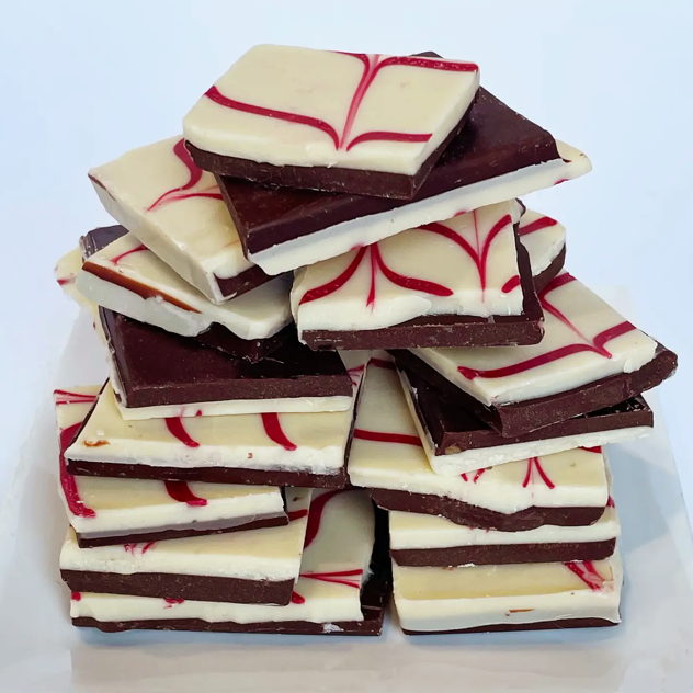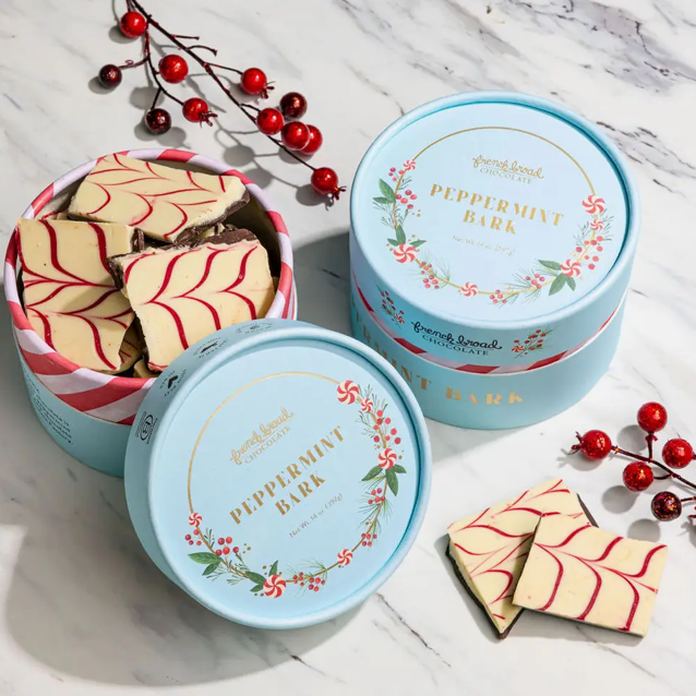 This delicious Peppermint Bark features bean-to-bar dark chocolate sprinkled with peppermint candy and layered with peppermint white chocolate; presented in a beautiful gold foil stamped package, ready for gifting. 14oz.