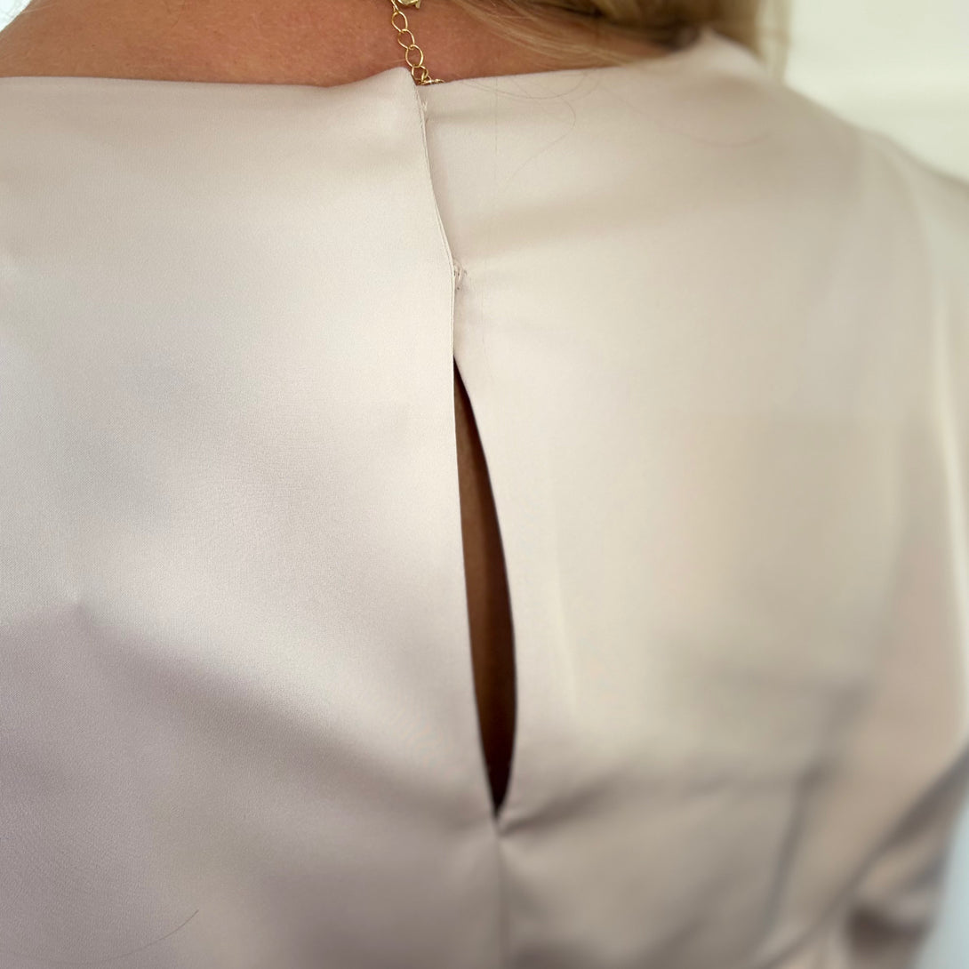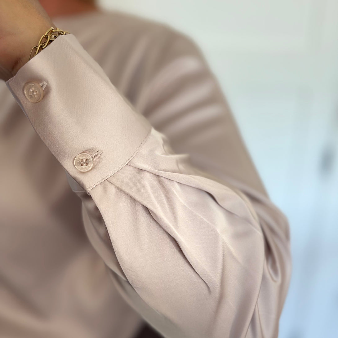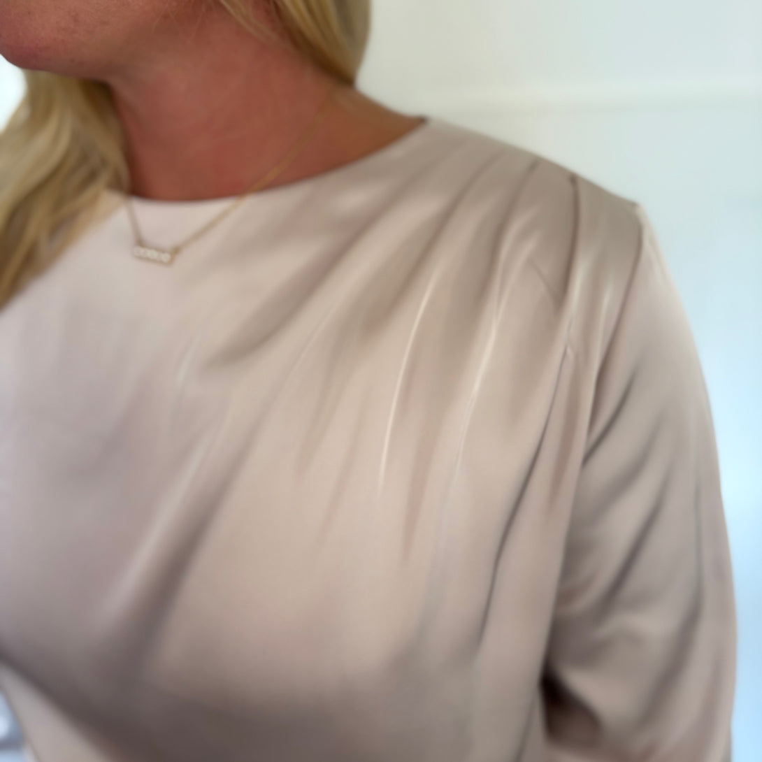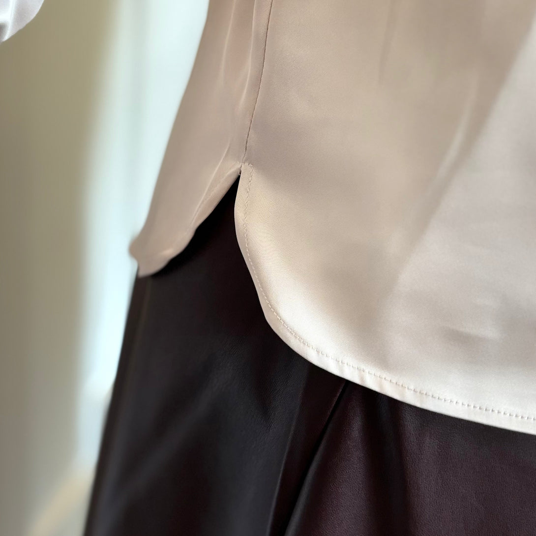 Elevate your wardrobe with this luminous satin blouse—a modern statement piece designed to embody glamour with ease. The fabric drapes fluidly, gliding over the skin and catching the light with every movement. A pleated detail at the left shoulder lends sculptural elegance, creating a refined silhouette that feels both elevated and effortless.