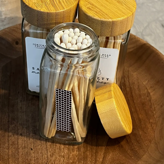 Features: Bamboo lid, 35 -- 3.5” matches per jar, striker on back of jar.