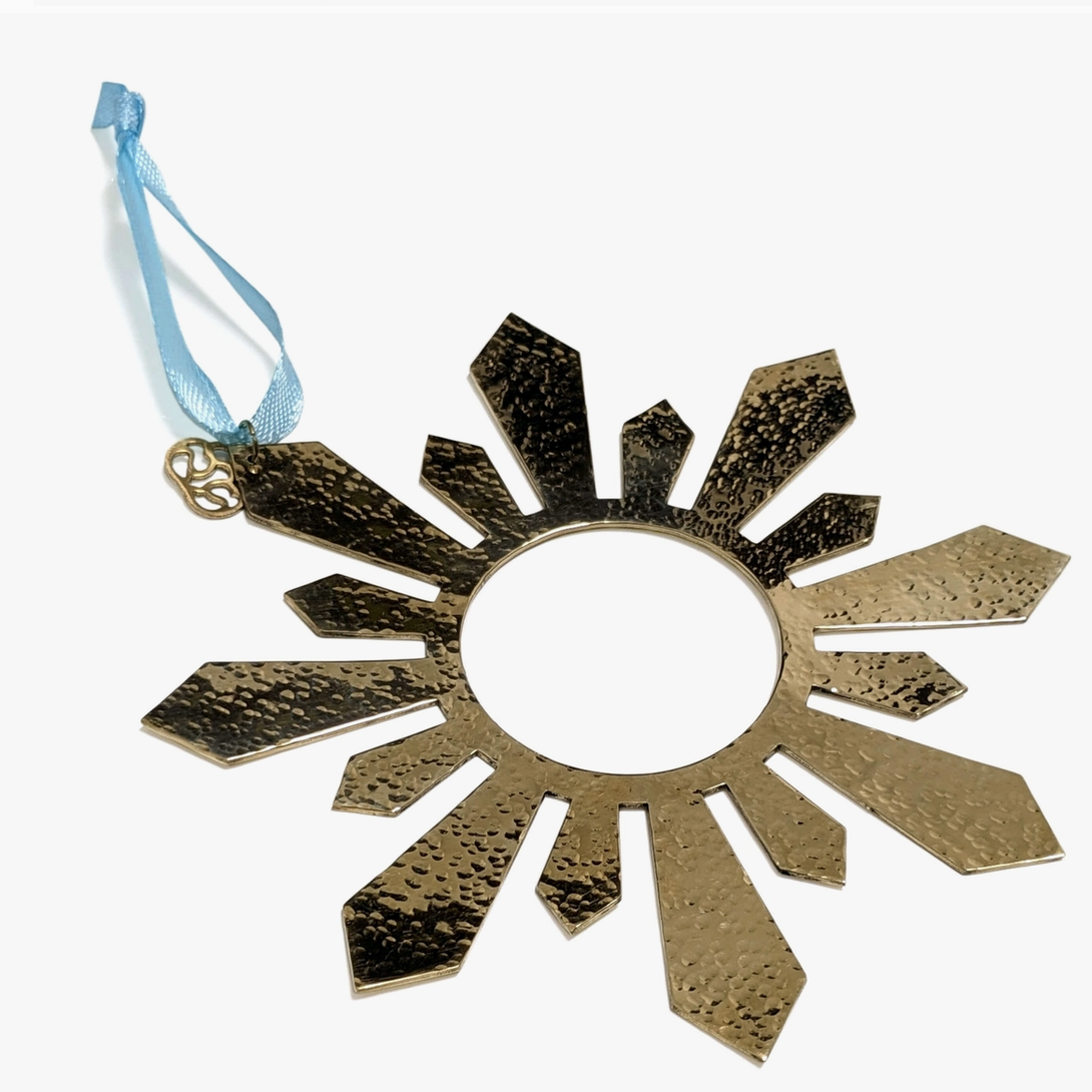 With a nod to 1920s art deco styling, this ornament adds unique celestial styling anywhere. Hand-hammered and polished by our artisans in the Philippines. The brass ornament is custom designed, and our Cebu artisans finish the metal, assemble them, and polish to a high shine. This ornament is perfect for your own home or to give as the perfect gift.