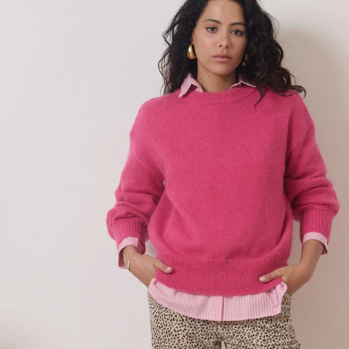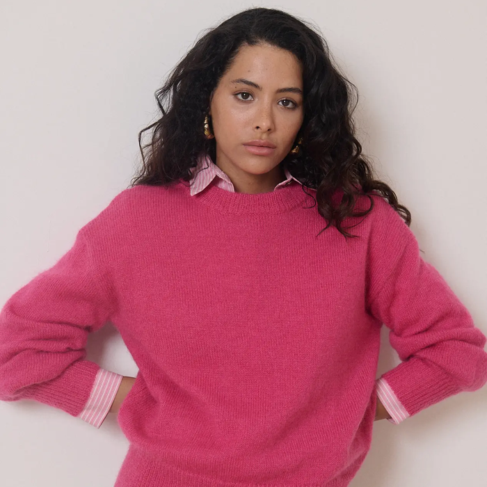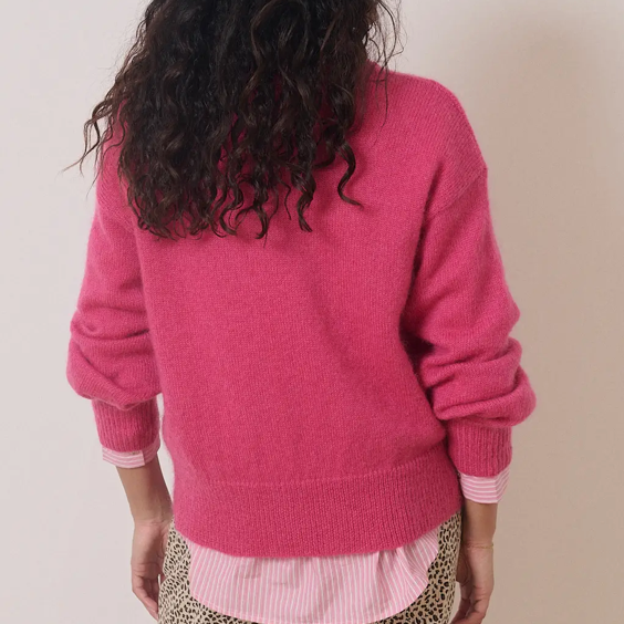 We adored this sangria pink sweater for the season! Features: Balloon sleeves, round neck, and wool blend for warmth and softness.