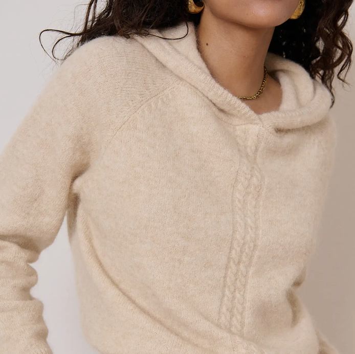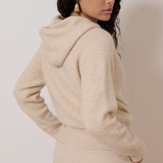 Hooded wool blend sweater in a lovely beige. We adored it paired with our wool trousers, denim, your favorite joggers and more!