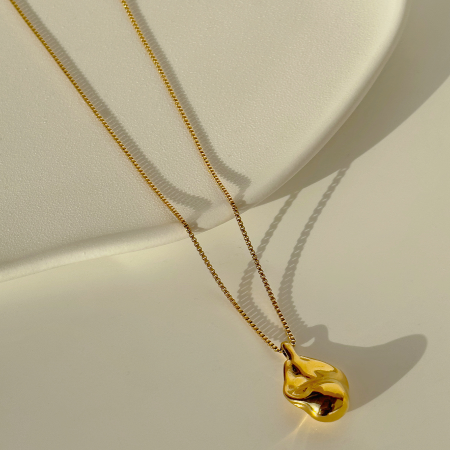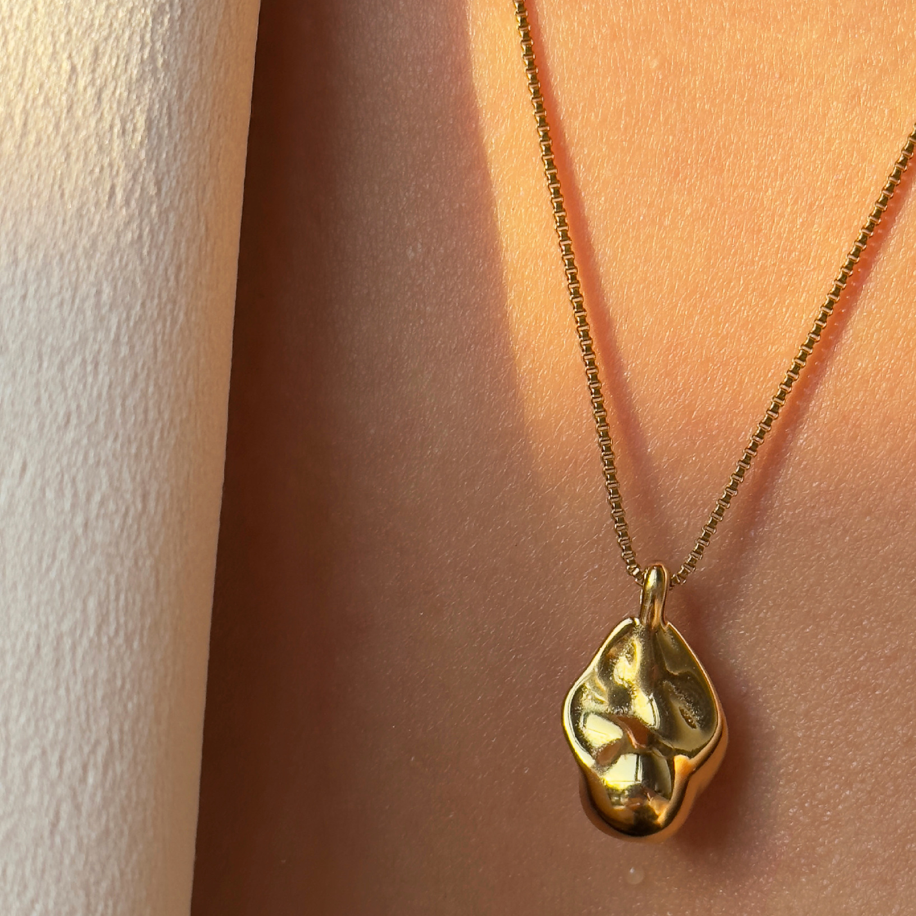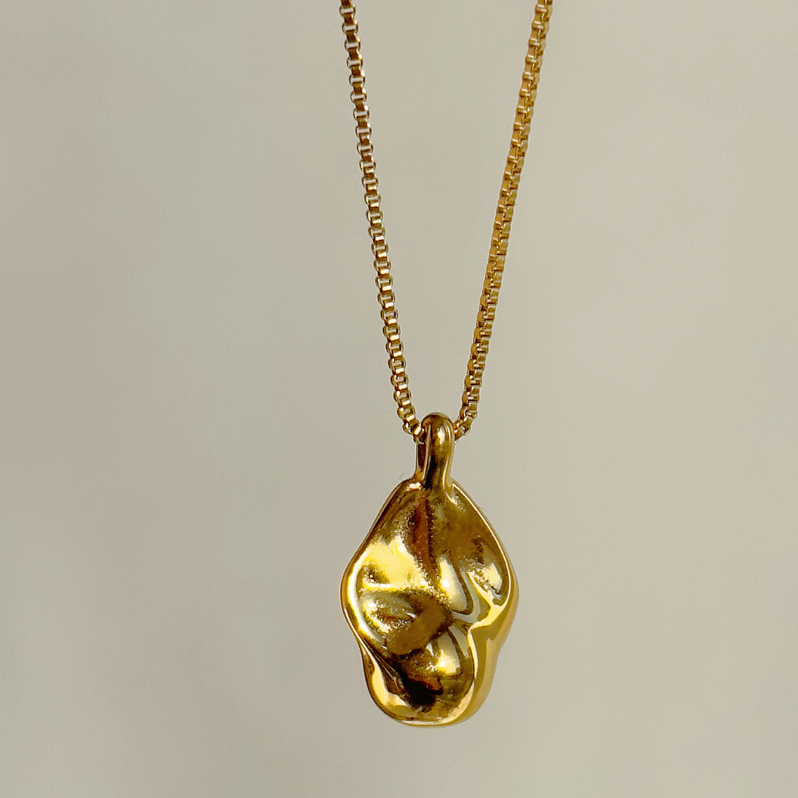 Simple, modern, and effortlessly elegant—this gold pendant necklace is a timeless piece you’ll reach for every day. Crafted from stainless steel plated in 18k gold, it features a delicate 16–18" adjustable chain with a softly sculpted gold pendant in a natural, organic shape.