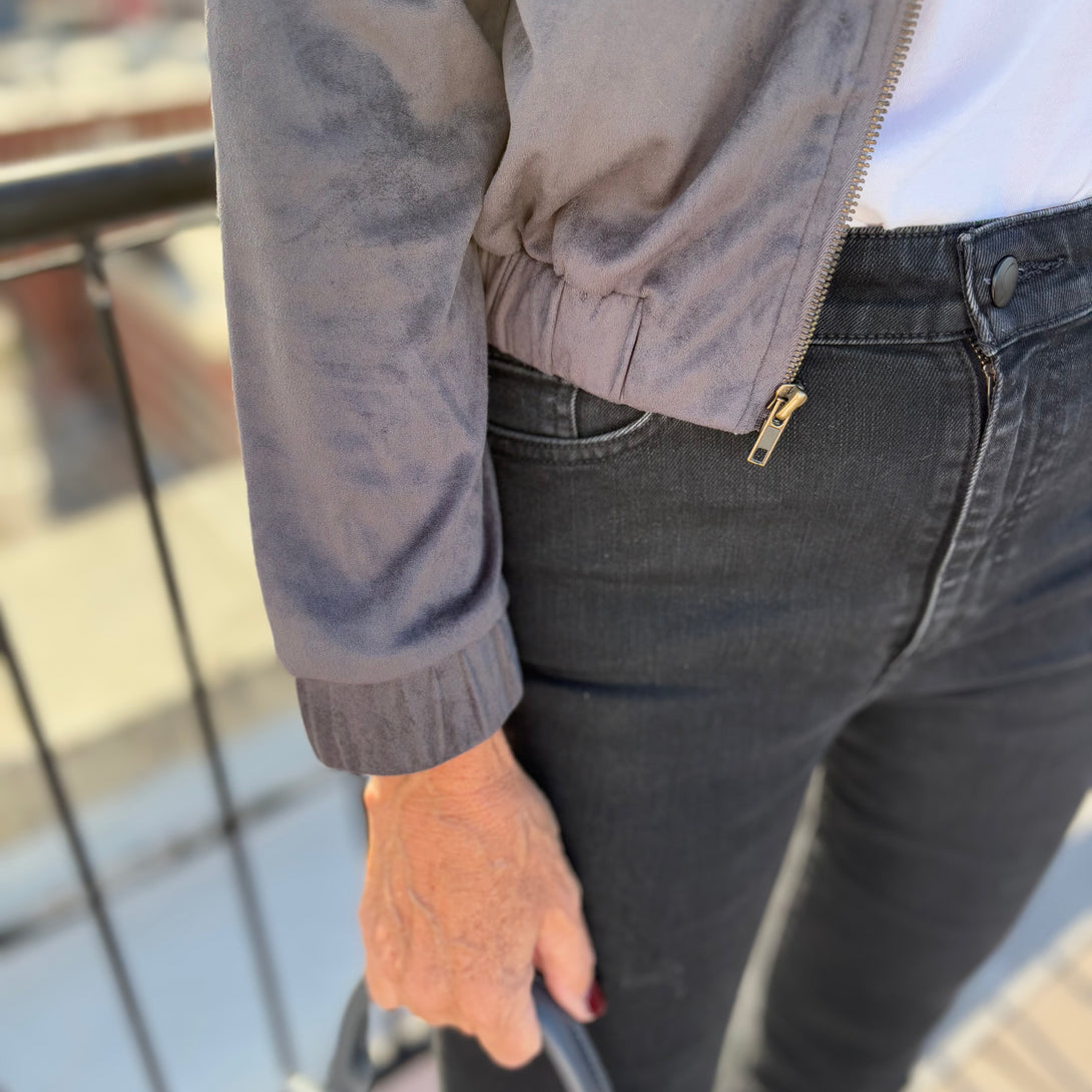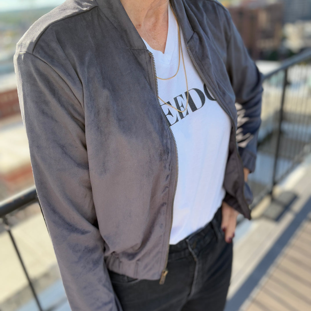 A nod to vintage style reimagined for the modern minimalist. Crated from ultra luxurious vegan suede, this statement piece combines the iconic silhouette of the classic 80's bomber jacket with a conscious, cruel free approach to elevated outerwear. The softness of the fabric gives you genuine suede feel, while offering effortless wearability and durability. Ethically produced in LA, this bomber is where timeless attitude meets sustainable innovation. True to size, but size up one for an uncompromising lose fit. (Model is size small, wearing size medium.)