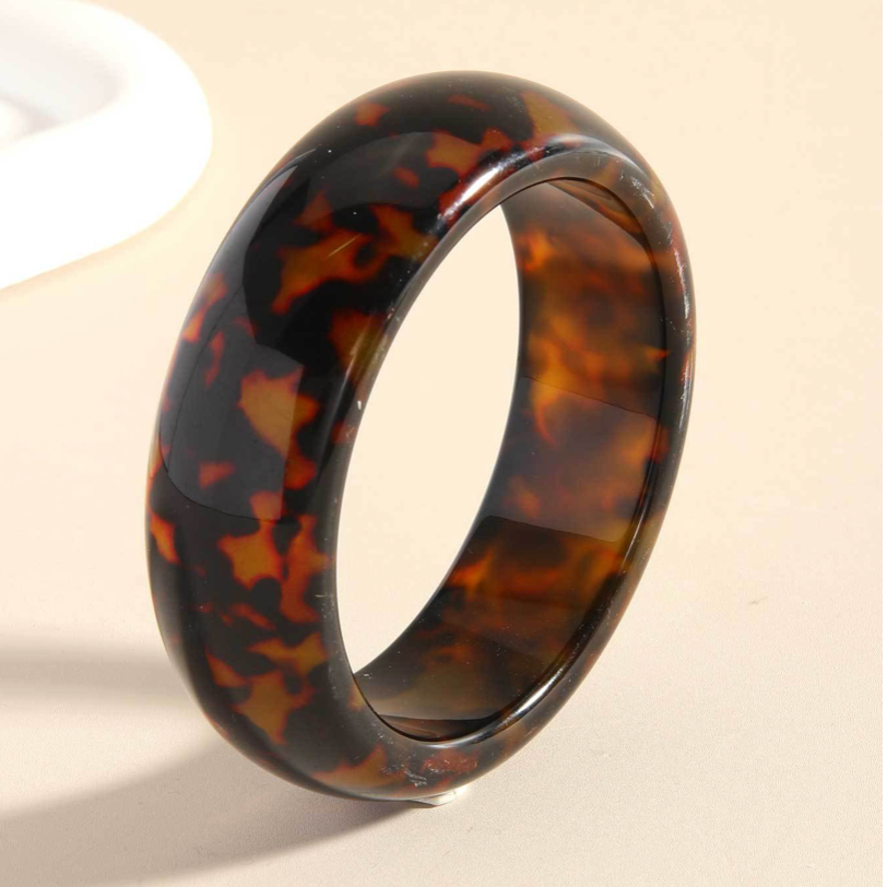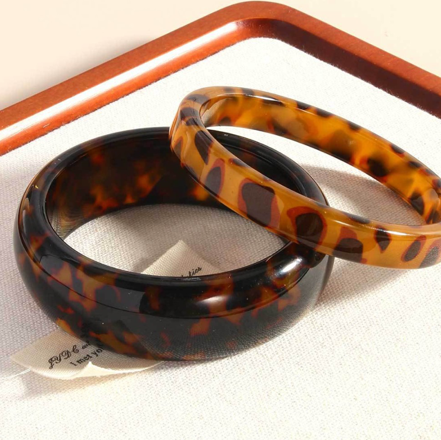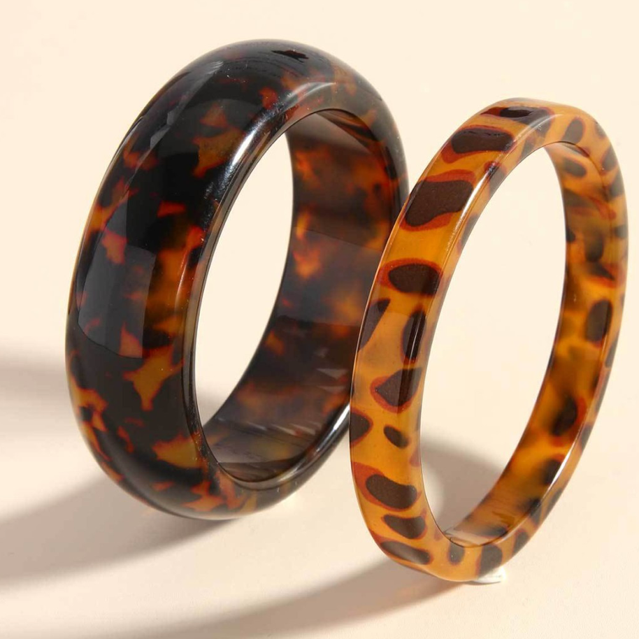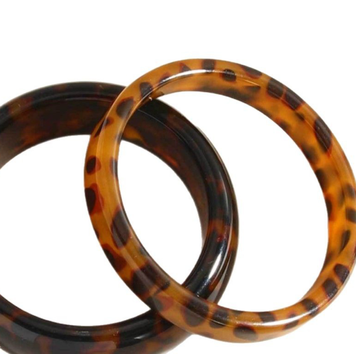 Add a touch of wild sophistication to your look with these chic resin animal print bangles. Available in thin or thick styles, each piece features rich shades of brown that capture the perfect balance of neutral elegance and playful pattern.
